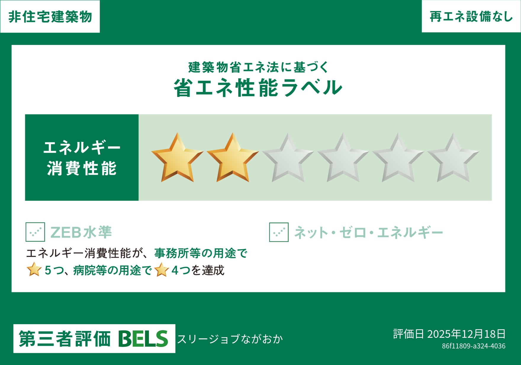 また、今回の工事で法人2棟目となる建築物省エネルギー性能表示制度『BELS』認証を取得いたしましたのでお知らせいたします。