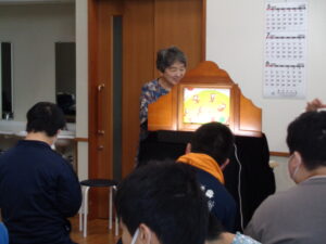 掲載した写真は「ゆうあい」のひとコマ。紙芝居塾(ながおか紙芝居ドン!パラリン様)による、音楽と紙芝居による読み聞かせボランティアです。やっぱり職員による紙芝居とは臨場感が違います!